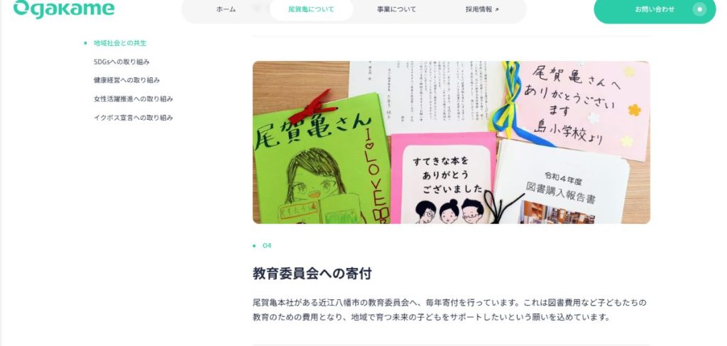 なかでも子どもたちに向けた「教育」の支援として、地元中高生のインターンシップ受け入れにより社会体験の機会を提供しているほか、本社がある近江八幡市の教育委員会へ毎年寄付を行っています。これは、図書費用など子どもたちの教育のための費用として活用されています。