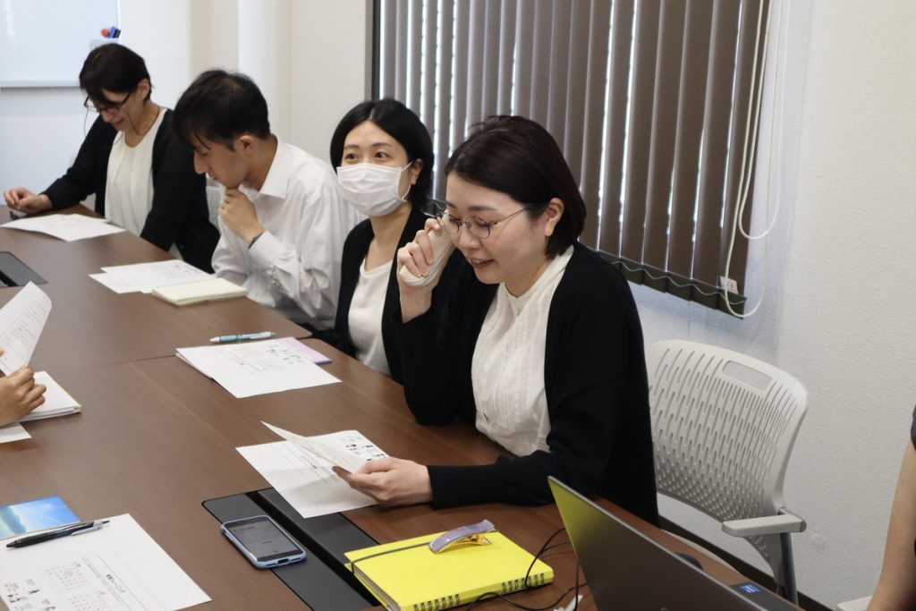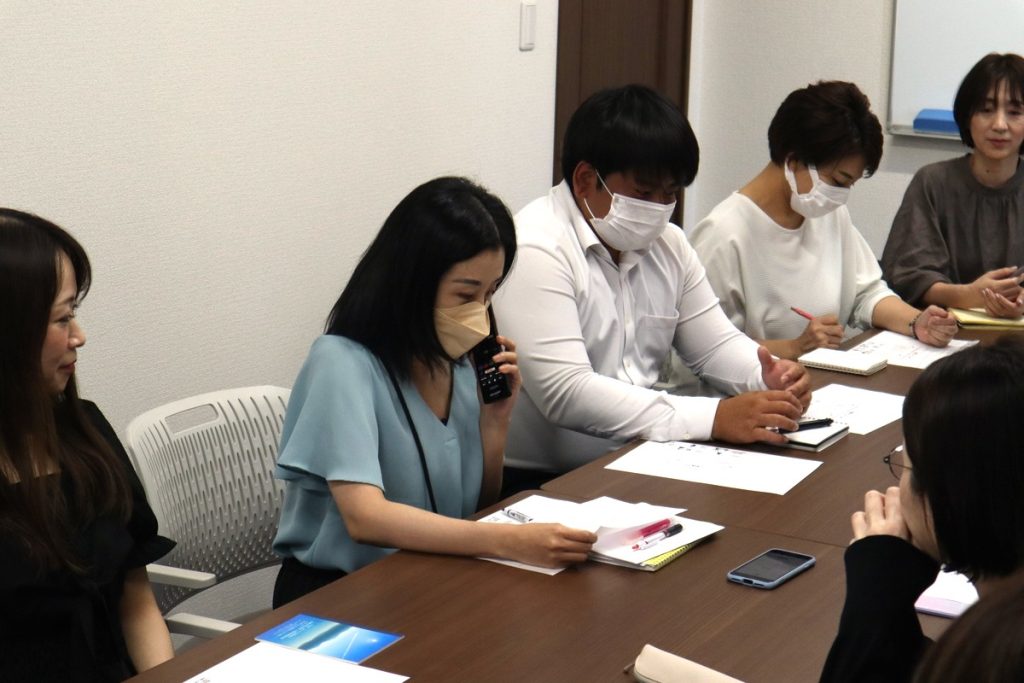 そのような流れで、「実践+意見交換」を順にやっていきます。自分の順番が来ると思うと緊張のあまり人の会話があまり耳に入らなさそうですが、皆さん、ときに頷きながら真剣に他の人のロープレを聞いていました。