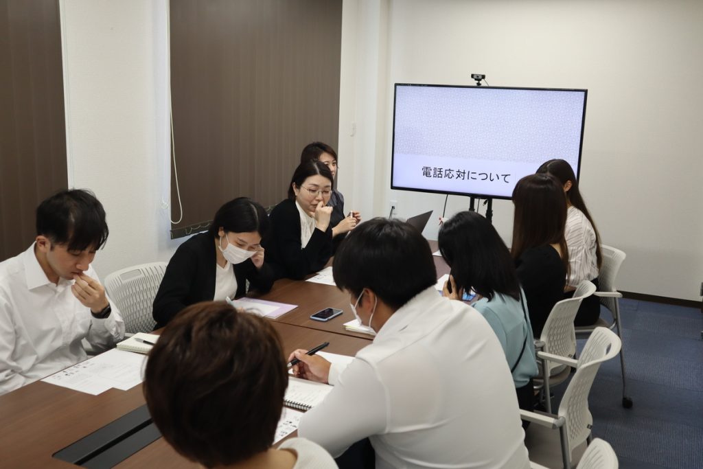 会議室には、普段電話を取ることが多い本社の内勤メンバーが中心に集まりました。ほぼ毎日顔を合わせているメンバーばかりのため、意見や感じたことが伝えやすい雰囲気。そんな中、まずは電話応対の基本を学びます。