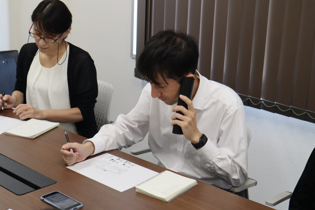 その後ペアになって“電話応対ロープレ”を実施しました。スライドでの説明は大変分かりやすく新しい学びがあったものの、説明を聞いただけではなかなか身にならないもの。実習形式で体験することでの気づきは多いです。