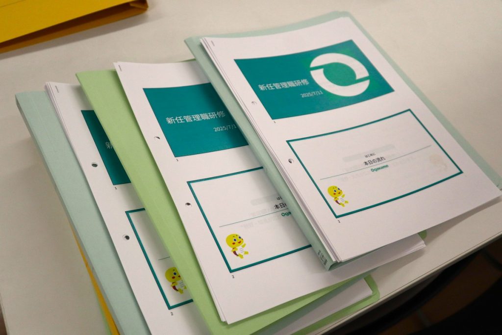 そんな悩みに寄り添いたいと内容を詰めていくと、どんどんとボリュームが膨らんでいく研修。「研修の目的」「管理職の役割と責任」「労務」「人事制度」など、必要に応じて用意した資料が7種になったというのも納得です。