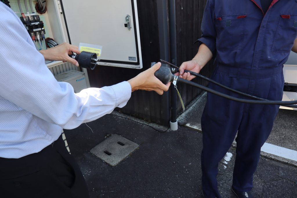 そして[商用発電機切替盤]のコンセントと、[非常用発電機]のコンセントをつなげば準備完了です!