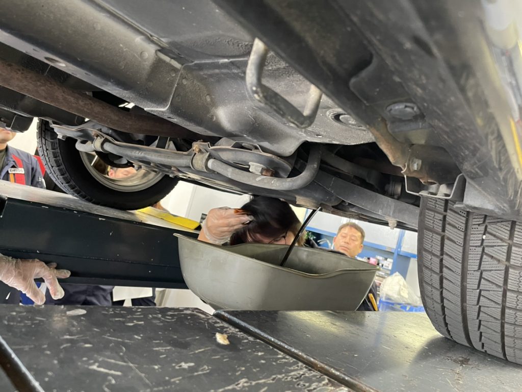 今回、新たに尾賀亀の一員となってくれたSSスタッフがいたので、オイル、オイルフィルタの交換をイチからご指導いただきました。(普段は、各SSの所長や経験豊富なスタッフが指導しています!)