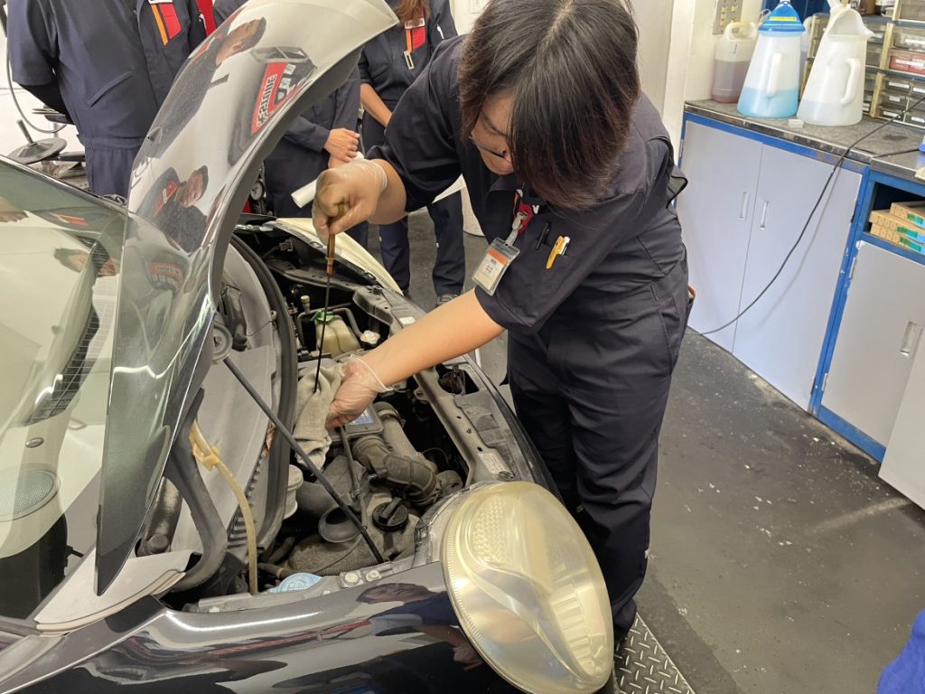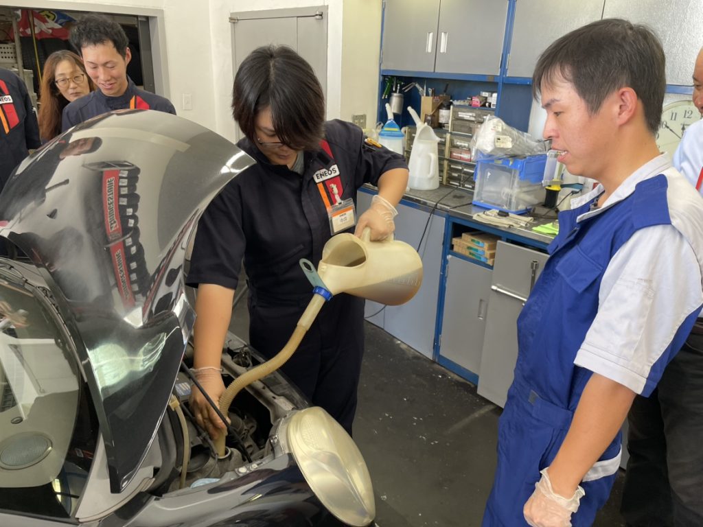 さて、その後は先輩スタッフに見守られながら新しいオイルを慎重に入れていきます。