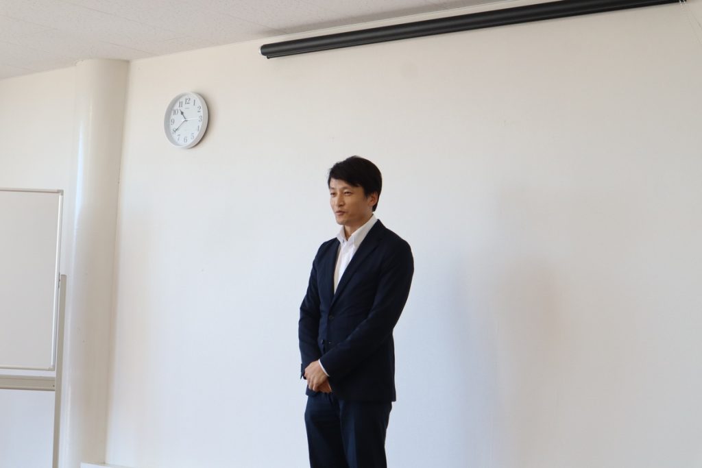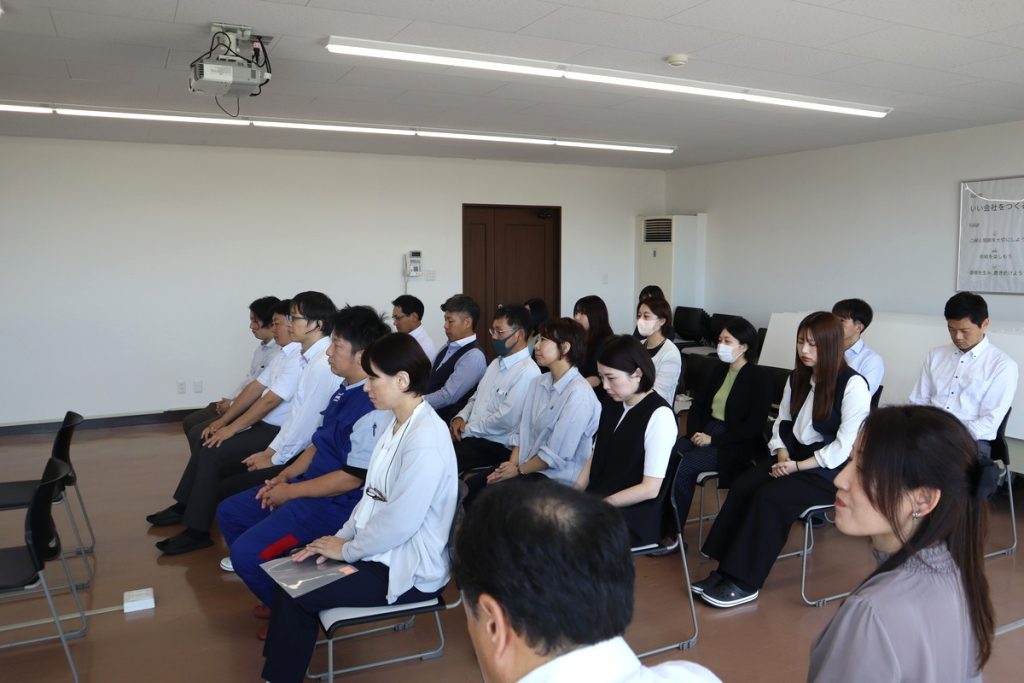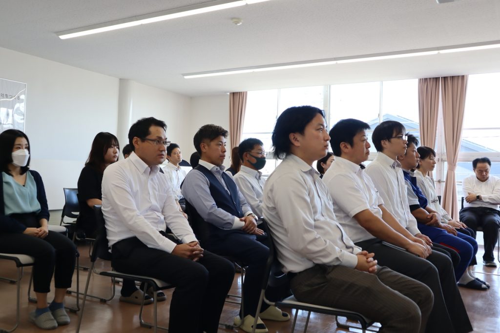 以前、採用の難しさについて話してくださった会長、そして部門長も、社長の話に耳を傾けます。尾賀亀としては二年ぶりとなる内定式。気持ちが新たになりました。