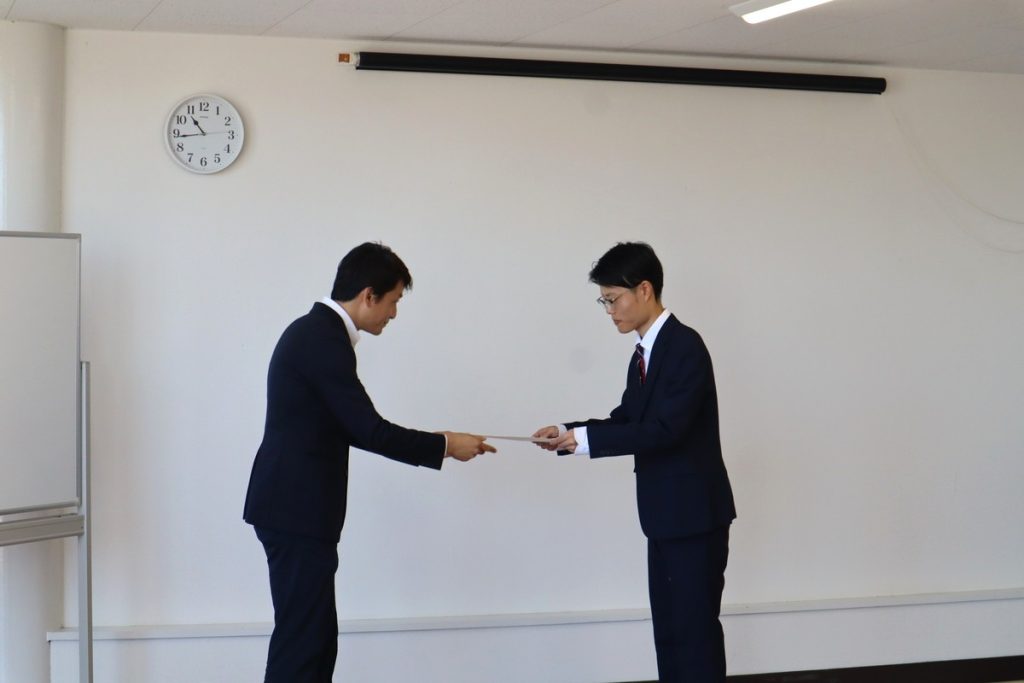 そして「内定証書の授与」が行われました。社長から内定者に直接手渡される内定証書。