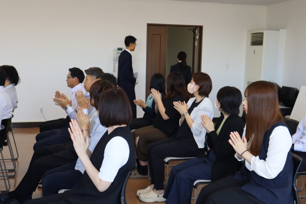 人事担当による式の説明、会長・社長との懇談の後、会場に登場したふたりを、本社にいるメンバーが拍手で迎え入れました。なんだかこちらも緊張してしまいます。