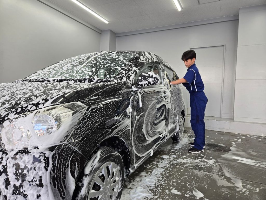 これまで学んだ技術を活かし、洗車から拭き上げまでをしっかり3人で行いました。仕上がった車はピカピカに!達成感のある表情が印象的でした。