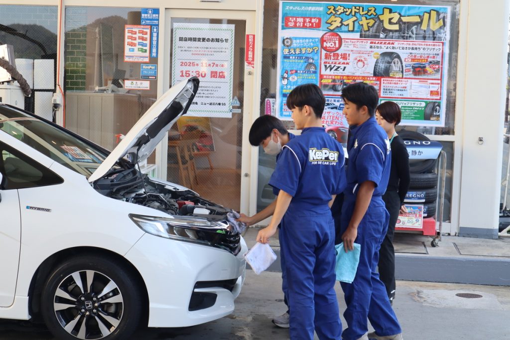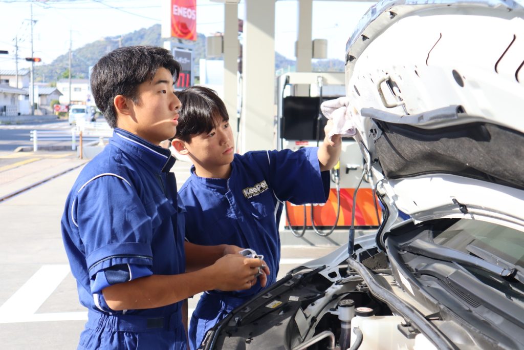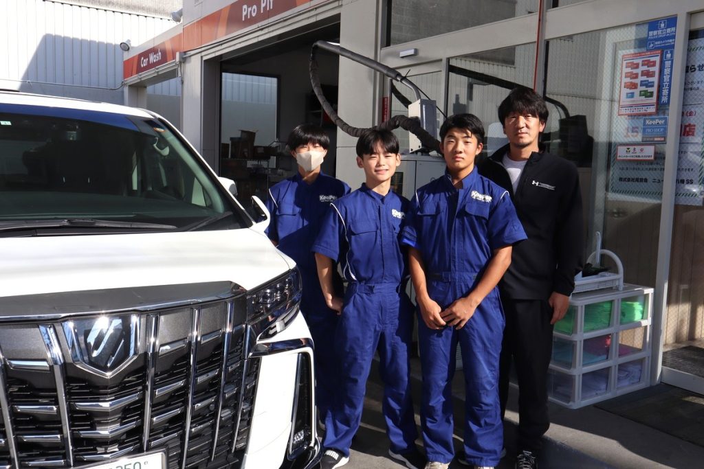 ボディや窓、ボンネットの隙間、タイヤホイルなど細かいところも丁寧に拭き上げてくれた中学生。この作業の間も、SSに来られたお客さまへ「いらっしゃいませ」と声をかけるなど、SSスタッフらしく務めてくれていました!