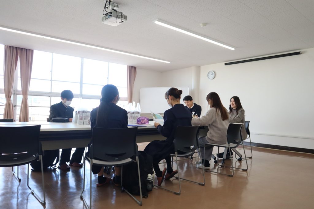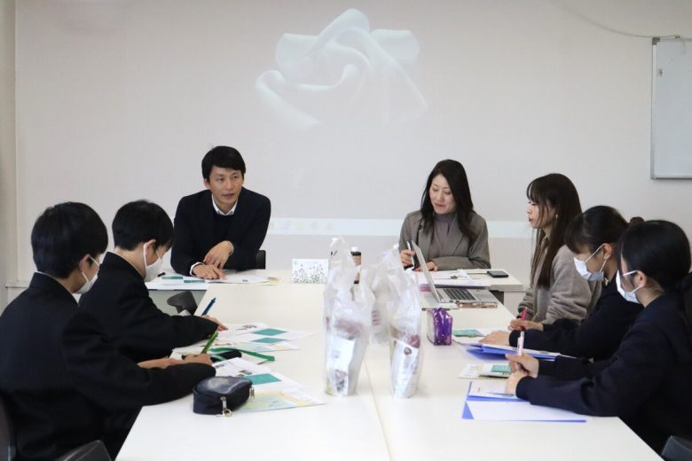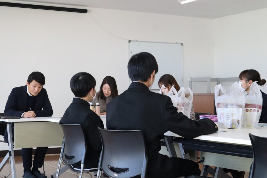 本社の見学後は会議室に戻り、学校のことや質問などをざっくばらんに話しました。ちなみに学生の皆さんからは、ガソリン高騰の際に工夫していること、一番自信のある食品の商品、フードロスの話などが質問されました。