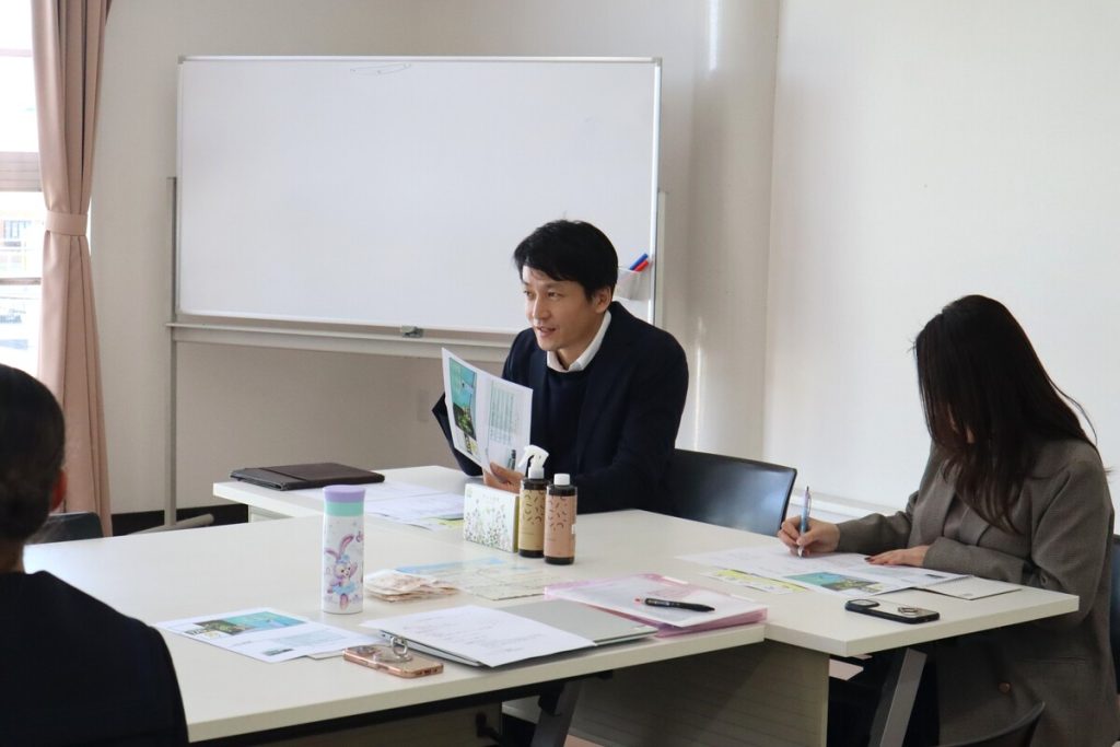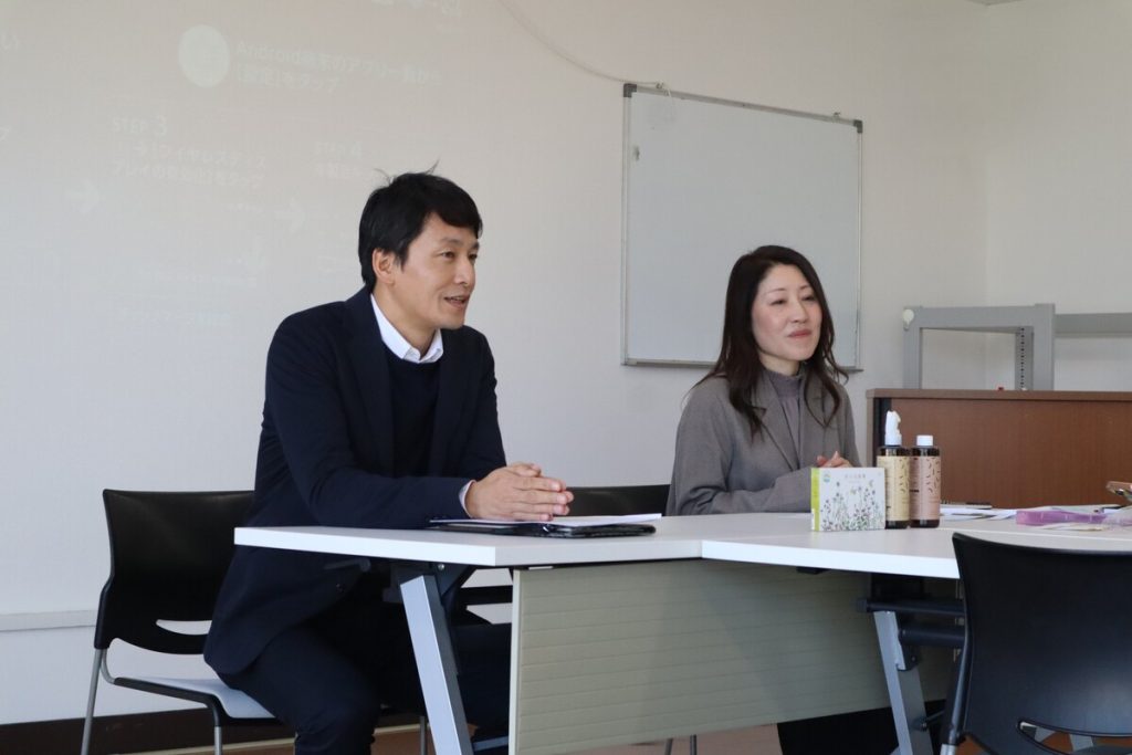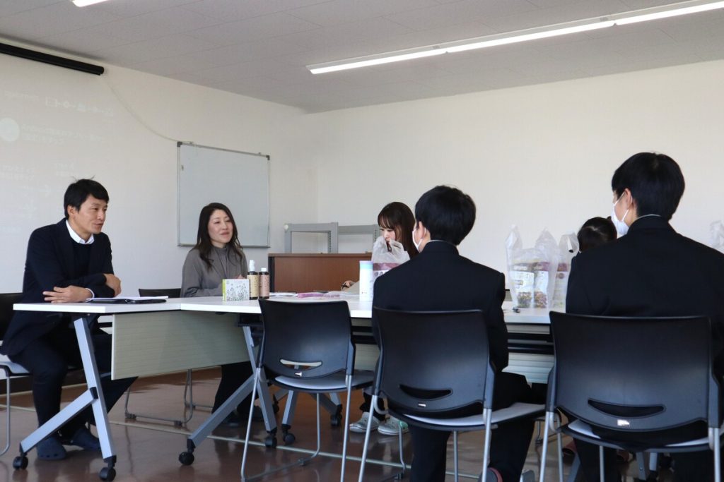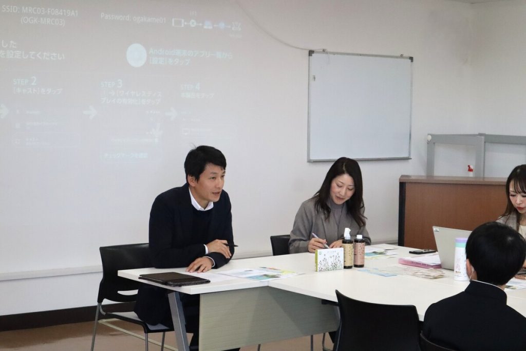 メモを取りながら真剣に話を聞いてくれた中学生。その他、オリジナル商品である「安土の秘蜜」や「goodbio」、海外(主にタイ)からお菓子の仕入れなどを行っていることも補足されました。