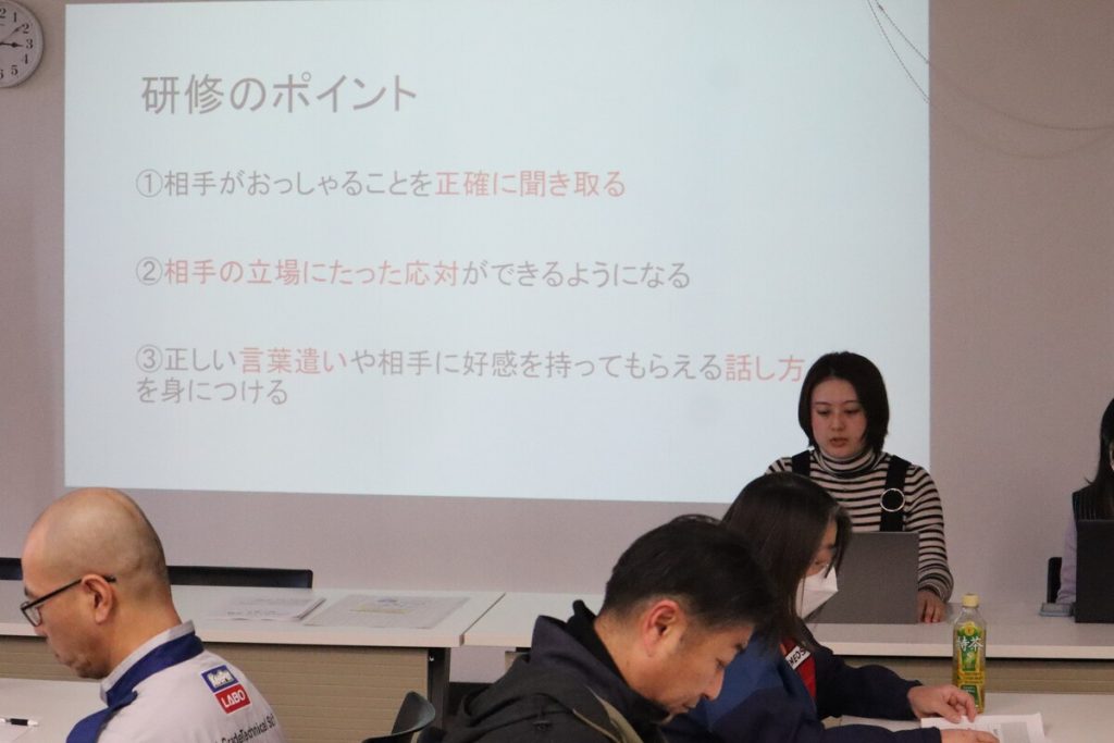 事前に同じ研修を受けたブロック長自身が驚いていた言葉遣いについての話や、「ソ」の音で話すと聞き取りやすいといった知識を学びました。