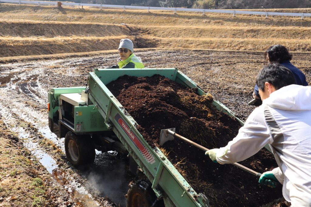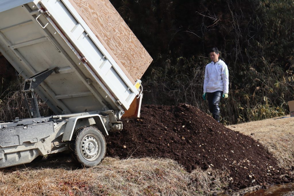 作業当日トラックで運ばれてきた鶏糞により、栄養をたっぷり含んだ土から稲がすくすくと育つことに期待がもてます。